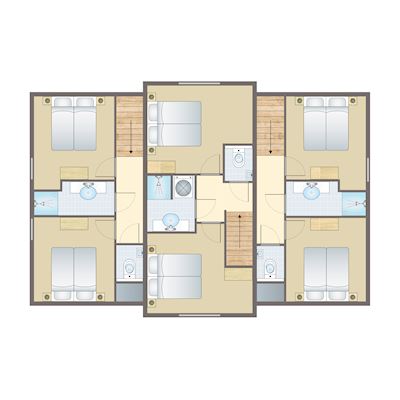 - Zes slaapkamers met twee 1-persoons boxsprings op de eerste verdieping
